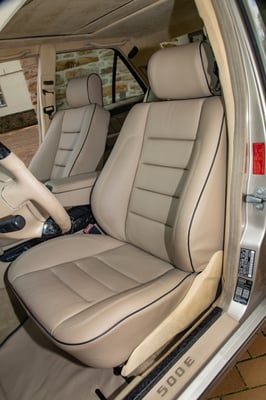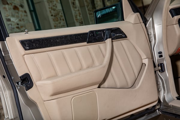 In der Hauptsache allerdings konzentrierte sich die PS-Sattlerei selbstverständlich auf das Interieur. Dieses wurde komplett erneuert, wobei Dennis Halverscheid und sein Team zwar den klassischen, seriennahen Look fortführten, dabei jedoch gekonnt moderne Akzente setzten. So wurde großflächig originales Mercedes-Benz-Leder in „Champignon“ verarbeitet – teils mit den vom Originalzustand bekannten Perforationen sowie in Kombination mit schwarzen Kedern. Zum Einsatz kommt es beispielsweise an den Sitzen, der Rücksitzbank, dem Armaturenbrett, der Mittelkonsolen-Einfassung, dem Lenkrad und dem Automatik-Wählhebel. Ferner wurden die neuen Fußmatten sowie die Einstiegsleisten mit 500 E-Schriftzügen aus diesem Leder hergestellt. Während sich der Innenhimmel und die Sitzschalenverkleidungen aus Alcantara in Sonnenbeige harmonisch in dieses Ambiente einfügen, setzen diverse Forged Carbon-Applikationen markante Kontraste: Neben der kompletten Mittelkonsole schimmern auch sämtliche Interieurleisten und diverse Einlagen sowie Teile des von der PS-Sattlerei neu modellierten Mercedes-Lenkrads im „chaotischen“ Muster dieser Carbonfaser-Variante. Im gleichen Stil wie das Interieur wurde ferner auch der Kofferraum gestaltet, welcher zum Zeitpunkt unseres Fotoshootings allerdings noch nicht vollendet war.
