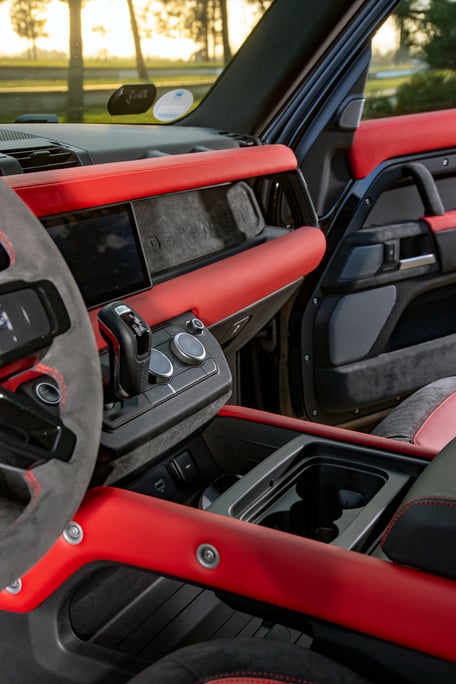 Horizontal über das mit schwarzem, genarbtem Leder überspannte Armaturenbrett ziehen sich zwei rot leuchtende Elemente, die das Tachoinstrument und das in Alcantara ausgeführte „Defender“-Relief vor dem Beifahrer einrahmen. Seitlich wird diese „Spange“ von in Wagenfarbe (Satorini Black metallic) lackierten Kunststoff-Elementen flankiert. Passend dazu wurde das Land Rover-Lenkrad überarbietet, dessen zugunsten eines angenehmeren Griffgefühls aufgepolsterter Kranz mit Alcantara und rotem Leder bezogen wurde. Die Funktionalität der Lenkradheizung wird durch diese Veredelung nicht beeinträchtigt.