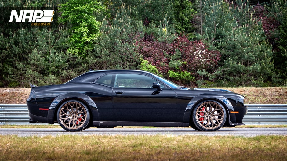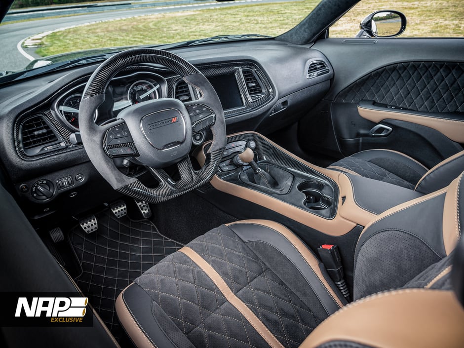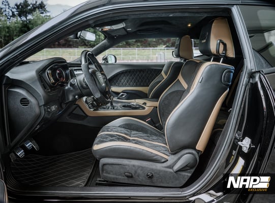 Bullig, breit und luxuriös. Das beweist dieser einzigartige Dodge Challenger. Edles Bentley Nappaleder, sportliches Echtcarbon und geschmeidiges Alcantara treffen hier aufeinander. Bei dem Exterieur stechen sofort die breiten Backen und die böse Optik ins Auge. Die 22 Zoll Vossen Monoblock Felgen und das KW Fahrwerk passen hier wie die Faust aufs Auge. Der Vorderlippenspoiler, Heckspoiler und die Seitenschürzen bestehen aus echtem Vollcarbon. Die Sitzausstattung Vorne und Hinten hat ein neues Design aus Alcantara, Nappaleder und perforiertem Nappaleder erhalten. Die Diamant Steppung ist handgefertigt. Der komplette Fahrzeughimmel ist mit feinem Alcantara bezogen, welches eine ganz neue Atmosphäre schafft. Die Mittelkonsole, die Tachoblende und der Schaltknauf sind von sportlichem Carbon überzogen. Alles in allem fühlt man sich sofort wohl und würde am liebsten nie wieder aussteigen.