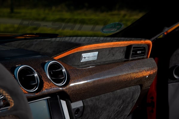 Bereits mit seiner leuchtenden Außenfarbe „Fury Orange“ und dem donnernden Sound aus den vier Endrohren seiner NAP-Abgasanlage zieht der hier abgebildete Ford Mustang GT die Blicke der Passanten und übrigen Verkehrsteilnehmer magisch an. Sein imposantes Main Event allerdings ist zweifellos das Interieur: Die Experten der PS-Sattlerei kreierten eine vollkommen neue, spektakuläre Innenausstattung in Leder, Alcantara und farbigem metallic Carbon.